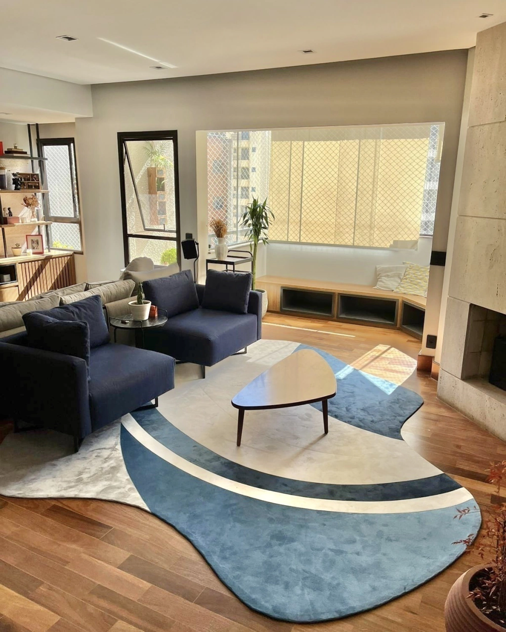 Na sala de estar, posicione o Bee parcialmente sob o sofá ou compondo com poltronas arredondadas. No quarto, ele proporciona conforto visual ao lado da cama ou como base para uma poltrona de leitura. Seu formato com bordas orgânicas adiciona movimento e leveza ao espaço, tornando o ambiente mais fluido e acolhedor.