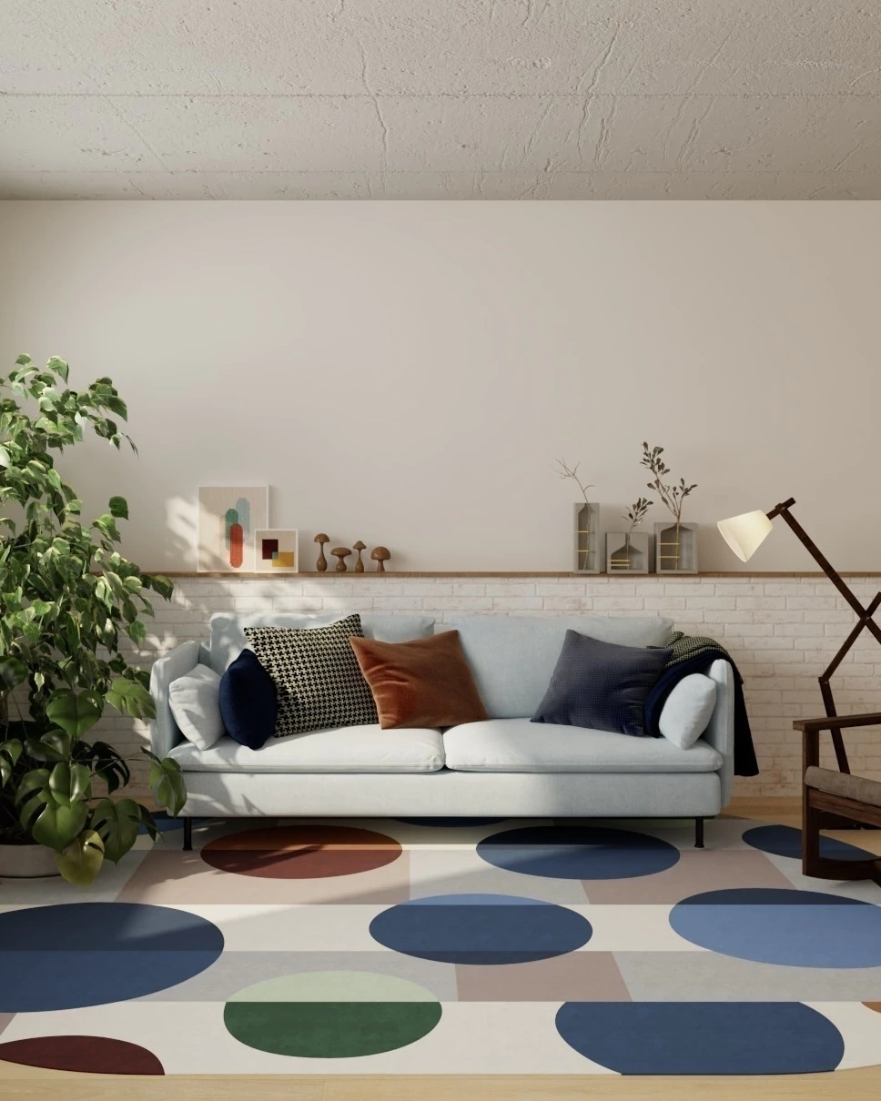 Ideal como tapete para sala, tapete para quarto ou home office, esse modelo valoriza estilos afetivos, contemporâneos e criativos. A combinação de cores traz profundidade e calor ao ambiente, harmonizando com madeira natural, móveis em laca fosca ou linho, e objetos com acabamento artesanal.