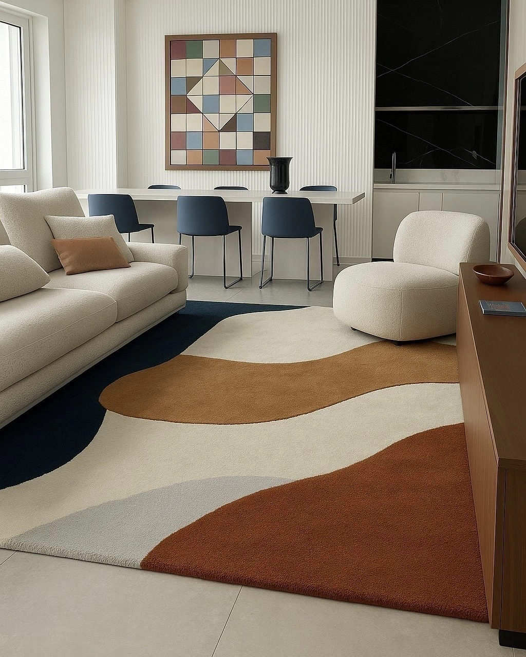 O Tapete da Coleção Wave traduz movimento, fluidez e equilíbrio em uma peça que combina cor, textura e sustentabilidade. O contraste elegante entre os tons de terracota, azul marinho, off-white e toques de cinza claro cria uma composição harmônica que traz acolhimento e personalidade na medida certa.