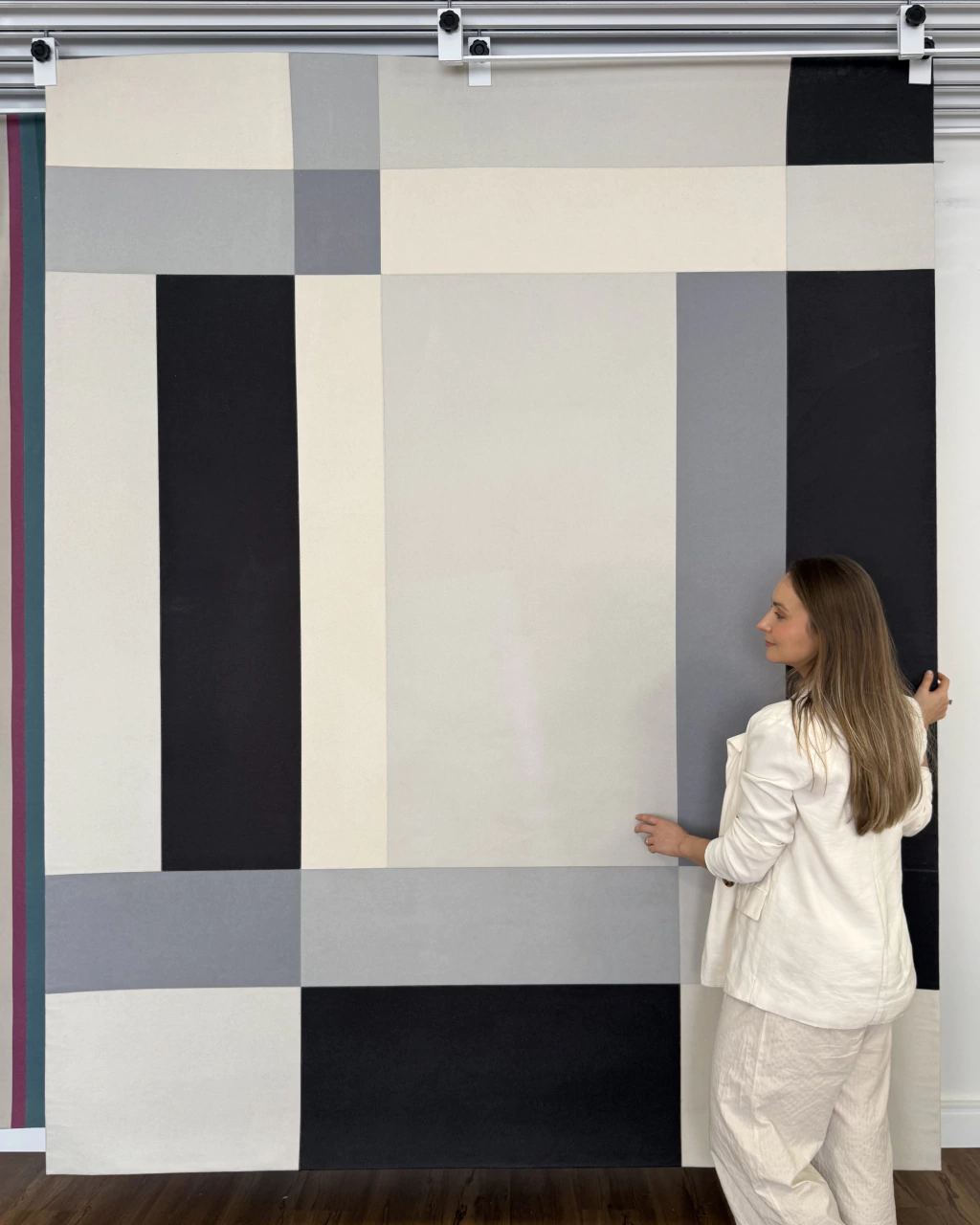 É um tapete que organiza visualmente a sala, valoriza o mobiliário e imprime identidade ao projeto.